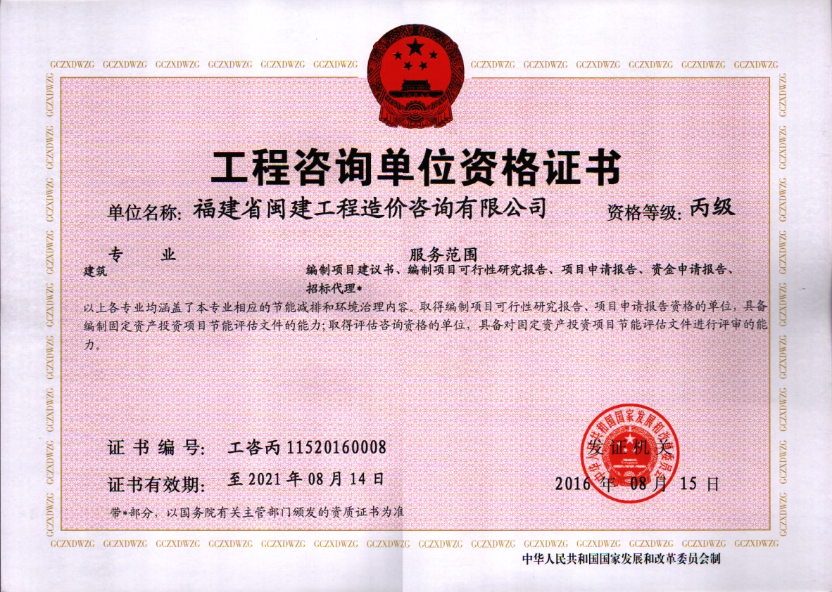 福建省閩建工程造價(jià)咨詢有限公司成立于1993年,原隸屬福建省建設(shè)委員會(huì),2001年脫鉤改制為有限責(zé)任公司,公司注冊(cè)資本1200萬(wàn)元,是一家具有甲級(jí)工程招標(biāo)代理資質(zhì)(證書編號(hào):F135000429)、甲級(jí)工程造價(jià)咨詢資質(zhì)(證書編號(hào):甲150135000084)、政府采購(gòu)代理資質(zhì)、預(yù)備級(jí)中央投資項(xiàng)目招標(biāo)代理機(jī)構(gòu)資質(zhì)(證書編號(hào):ZYTZ-C2013239)、丙級(jí)工程資質(zhì)(證書編號(hào):工咨丙11520160008)的綜合性工程咨詢服務(wù)單位。能承擔(dān)各類建設(shè)項(xiàng)目的工程招標(biāo)代理、工程造價(jià)咨詢...